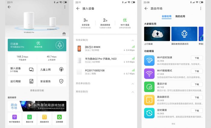 华为路由器Q2 Pro作为一款千兆子母路由,无论是颜值还是网络速度体验了一段时间是挺满意的, HiLink键可以给智能产品一键配对,支持华为的智能手机进行一键连接WIFI,在智能家居APP的商城中可以看到很多支持的智能产品,越来越多的智能产品也在加入到华为生态链,对于用户来说体验更好了!非常方便实用!
