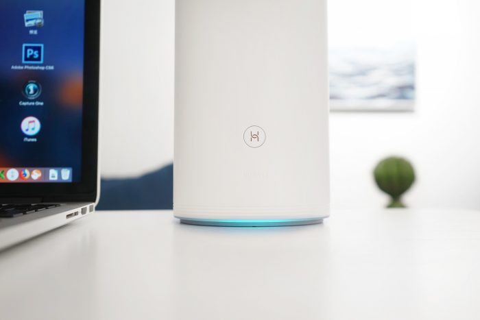 外观方面:华为路由器Q2 Pro延续了前作极简设计,相对传统路由器要美观不少。母路由呈椭圆形柱体形状,除了正面的HiLink按钮外就只有下方添加了几条螺纹线条装饰,在接通电源之后,机身底部的蓝色环绕状态灯就成为了点睛之笔,显得更加纯净、优雅。