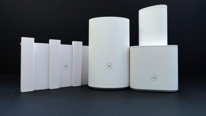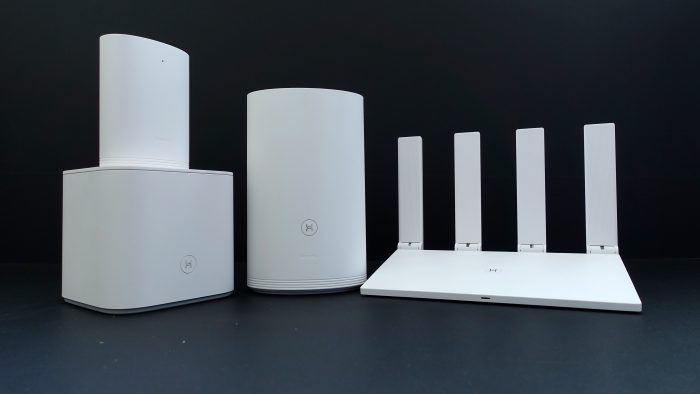 这里就不在过多对包装盒进行详细的展示了,然后再来看看这三个产品的长相如何?哦,不好意思数错了,应该是四个东东。这四个东东可谓是造型迥异,先来说说华为路由Q2 Pro,这个路由器是子母装,由一大一小组成,母子俩的造型都是椭圆柱形状的。而华为路由WS5200看起来就和传统的路由器差不多了,不过头上的四根宽面天线采用了可折叠设计,省去了自行组装天线的麻烦。最后就剩下荣耀路由Pro2了,这个东东好方,也采用内置天线设计,所有头上也没有多余的角。