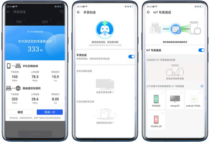 不管是华为路由器还是荣耀路由器,它们的APP功能都相对完善,至少在我体验到的所有路由器中,华为路由器的APP功能应该算是最全的。在比较完各个路由器的特点功能后,接下里就让我们体验看看这三款路由器在信号衰减、传输速度、功耗测试、发热测试和游戏体验中,又有怎样的表现呢?