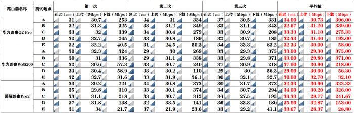 测试网速为300M光纤宽带,测试方式采用在每个测试点测试三次数据,然后求均值。从下图可以看到在A和B两点,华为路由WS5200是最好的,但是在C、D和E三点,华为路由Q2 Pro都要优于其他两款路由器,同时在E点测试点,荣耀路由Pro 2的下载速度达到了最差。