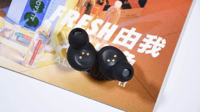 耳机内侧设计有三枚金属触点,用以与收纳仓内的触点接触充电。耳塞部分倾斜向上在耳机内侧顶端,符合人体工程学结构。与此同时,AIR PLUS还支持IPX5级别的防尘防水,能够抵御日常轻度的灰尘和泼溅。