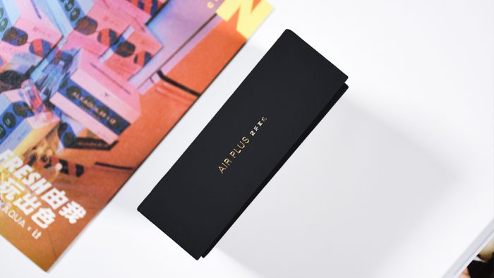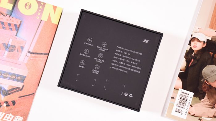 JEET AIR PLUS采用黑色天地盒包装,包装整体使用印刷行业比较高端的布纹纸,视觉观感和触感比较舒适,凸显科技感与高端感。盒盖正面烫银印有JEET标识,两侧以UV工艺印有JEET AIR PLUS的耳机线条轮廓图,整体设计极具诚意。