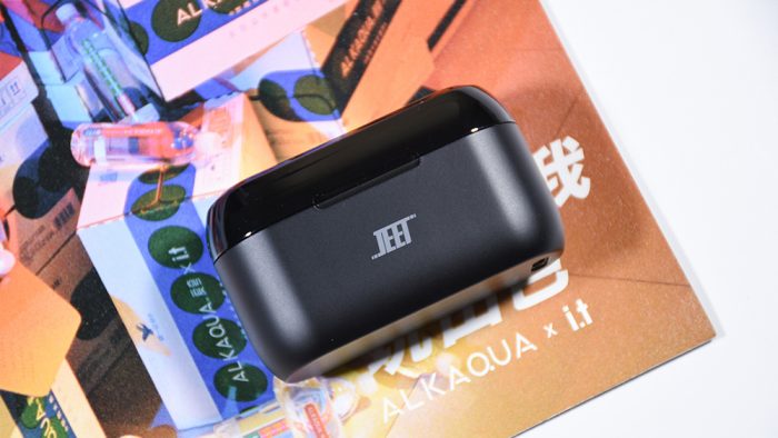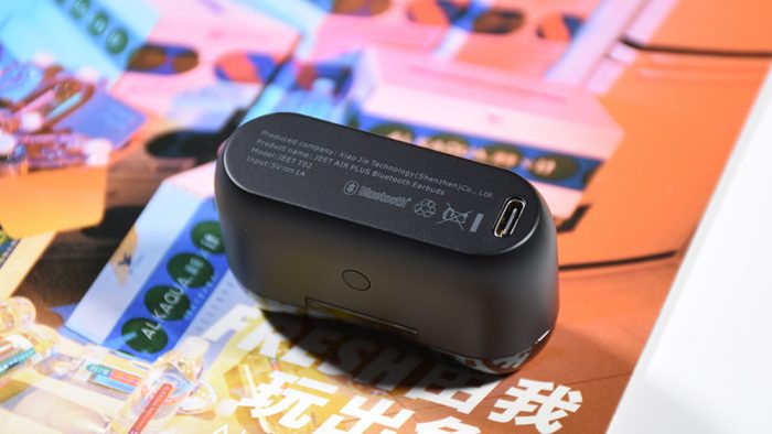 收纳盒底部印有AIR PLUS的信息,全英文就不过多解读了。靠右的位置留有Type C接口,用来为收纳盒充电。不过稍显遗憾的是,在JEET耳机产品线中处于高端定位的AIR PLUS并没有无线充电功能。