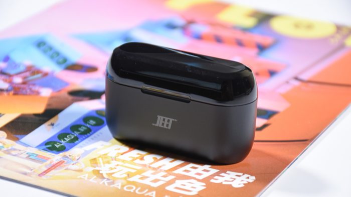 收纳盒正面中心处印有JEET品牌标识,上方为打开盒盖的扣手,设计有凹槽便于打开。盒子背面中间设计有一枚圆形按键,根据官方介绍这枚按键是配对按键,按下后双耳可以完成配对操作。