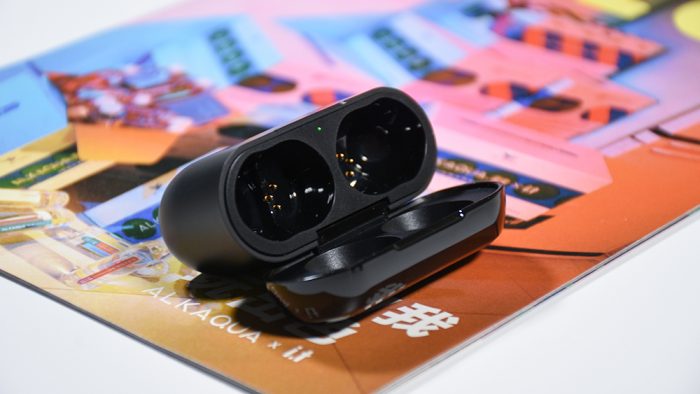 AIR PLUS就放置在收纳盒的椭圆形凹槽中,内有金属触点和磁吸功能用以固定耳机和充电,靠近中间的位置设计有一枚指示灯。需要注意的是,收纳仓无左右耳标识设计,实际放置对调以后无法正常放入。