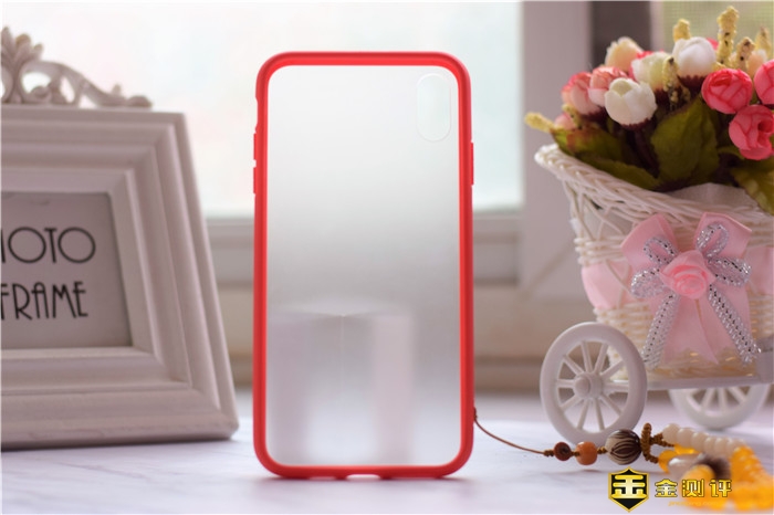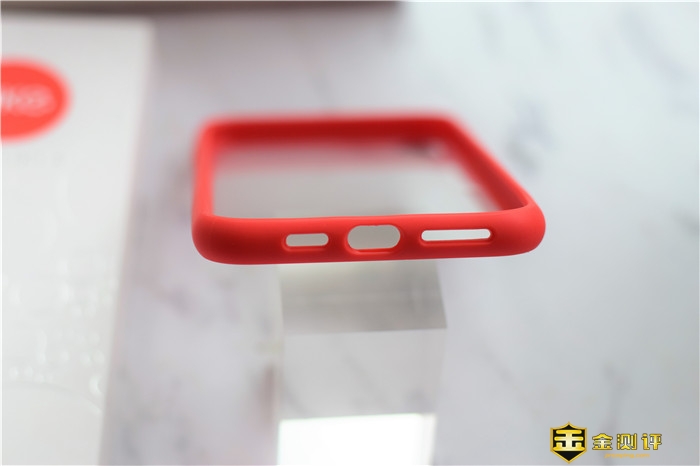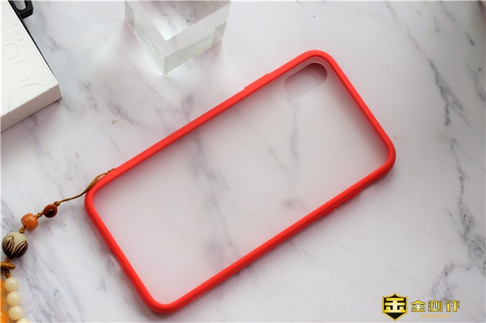 保护套底部为开孔区域,做工较为精致;保护套背面是采用了透明钢化玻璃的设计,四周则是红色的非牛顿流体材质的边框,边框四角采用蜂窝防震气囊设计。