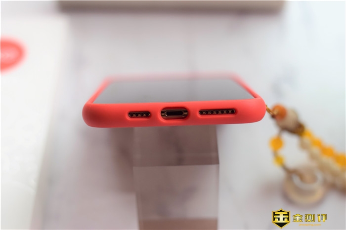 底部的开孔准确,并且是根据iPhone XS Max不对称的实际情况进行的开孔,开孔上没有出现毛刺的情况。保护套的顶部则没有任何开孔。