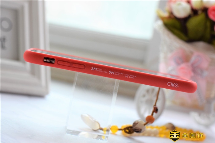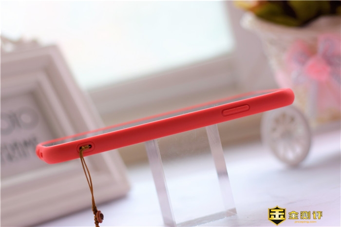 把外面的塑料袋去掉之后,可以看到,整个保护套可以说由两部分组成:后背的透明钢化玻璃部分、四周红色的边框。四周大红色的边框采用非牛顿流体材质,这种材质不仅可以保证较好的手感,还能够有效地保护手机。
