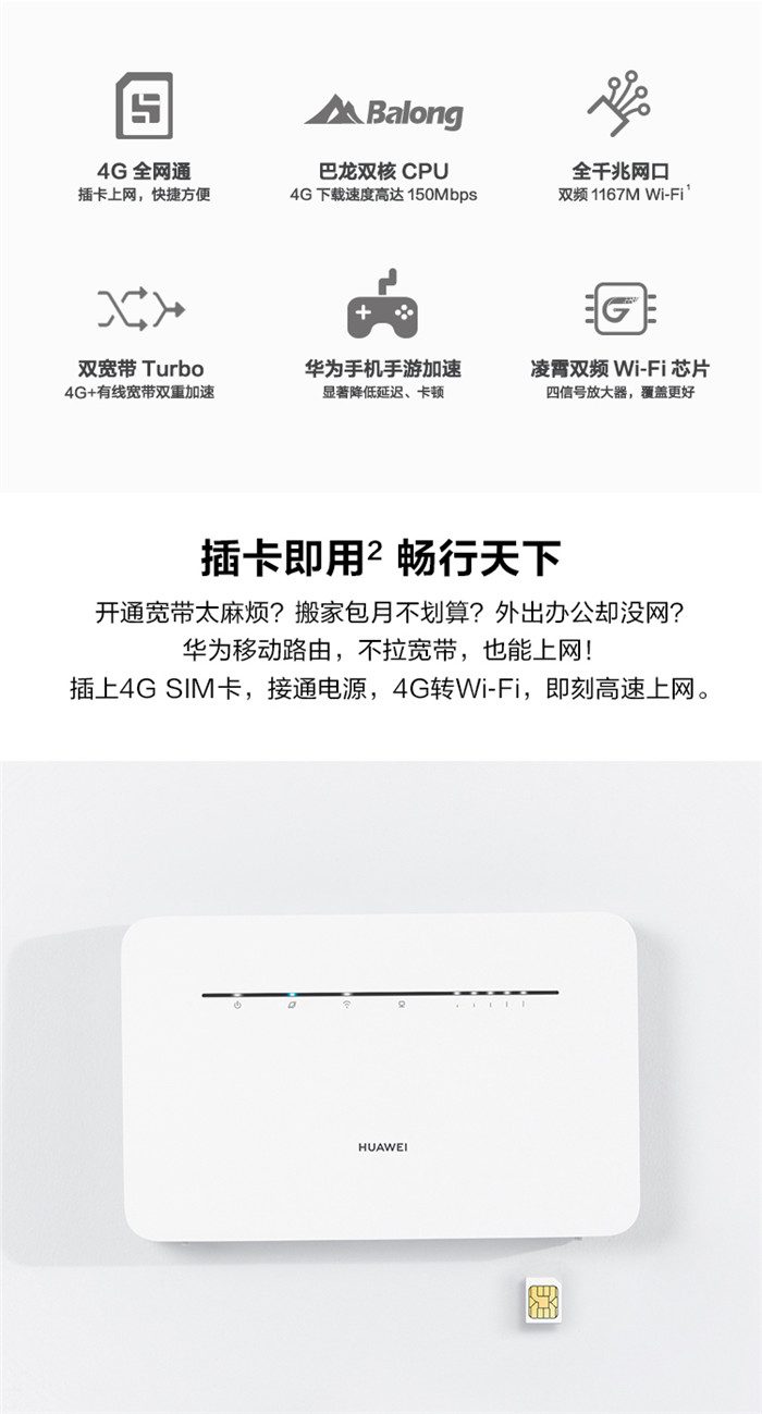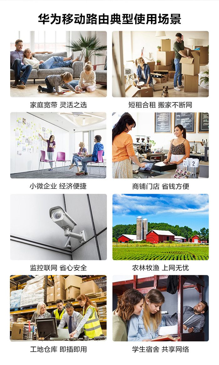 华为移动路由是华为推出的可将无线信号(4G/3G/2G)转化为Wi-Fi信号的全新路由器系列。除了具备传统路由器插网线上网的功能,华为移动路由还具备插卡上网的功能,能够有效解决宽带覆盖不佳的问题,满足用户随时、随地上网的需求,广泛应用于家庭、企业、出差、旅行、展会、监控、农林牧渔、工地仓库等场景。