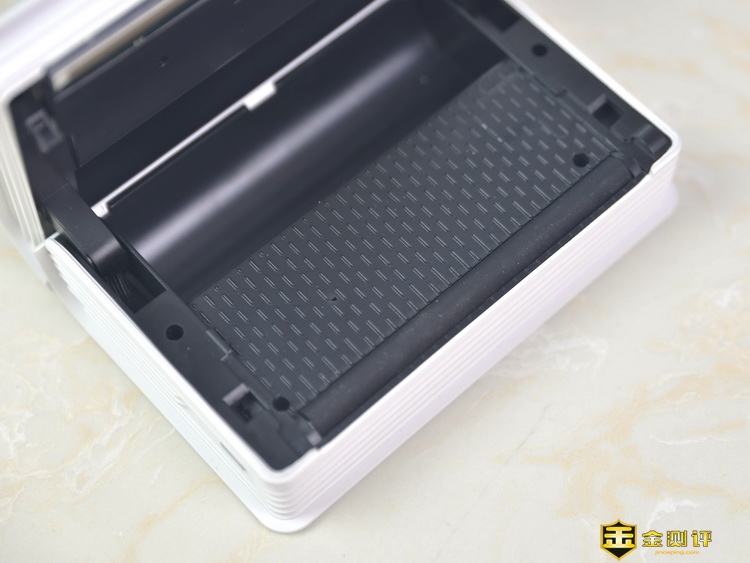 按下开盖键,就可以打开喵喵机MAX打印机的上盖了,可以更清楚的看到裁纸刀,裁纸刀的下方就是打印头了,左右两侧各有一个卡扣,用来合下后固定住上盖的,在左侧卡扣的下方设计有Reset重置按键。当喵喵机MAX打印机出现什么奇奇怪怪的问题的时候,可以尝试通过这个Reset键将机器恢复出厂设置,这样通常能解决很多奇葩问题。