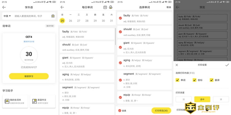 英语学习一直是备受关注的,而喵喵机在这方面的很强大,有翻译功能,还有背单词、生词本、英语作文等功能,背单词是积攒词汇量最重要的途径的,每日30个单词,很有必要,打印出来带在身上,有空就拿出来看看也挺好。打印单词的时候还能选择音标和翻译,很赞。