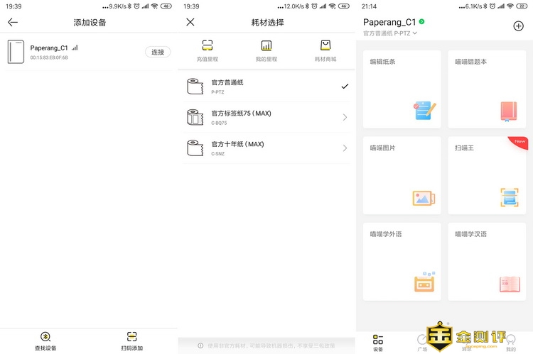 喵喵机MAX打印机与手机的链接很简单,只需要打开手机端喵喵机APP,然后添加设备,就能发现开机的喵喵机MAX打印机,轻松连接。连接完成后就可以选择耗材,目前是官方的普通纸,此外还有其他两种纸可以选择,以后要试试十年纸,这种纸打印出来能保存10年,普通纸大概能保存一年,差距很大。喵喵机MAX打印机预设的功能模块很多,两页共有10种。