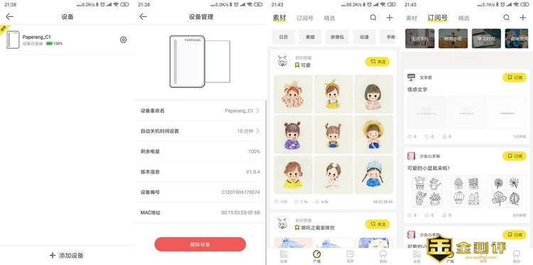 连接后的喵喵机MAX打印机,可以查看设备的信息,我修改了自动关机时间,改成了半个小时,10分钟指不定我还在挑打印模板呢。在广播里,有用户自己上传的打印素材,分类众多,内容也非常丰富,此外还有订阅号,这样方便关注一些高手,有新素材也好查看。有了广播里的这些内容,可以打印的内容就更多更多了。