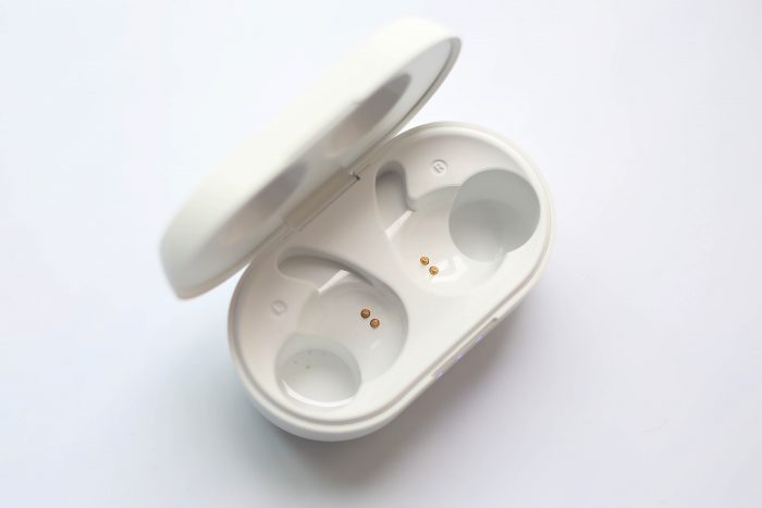 打开电池仓还可以看到每一侧各有两个金属触点,放入耳机即可充电,还带磁吸功能,用起来非常方便!