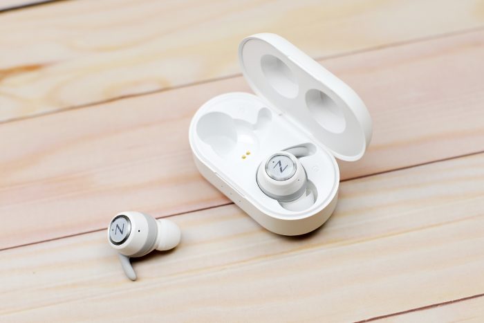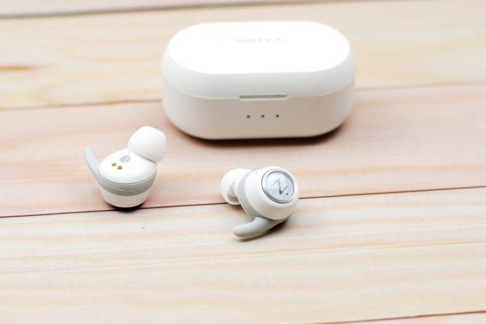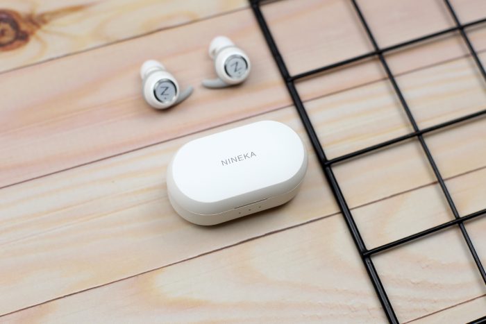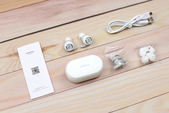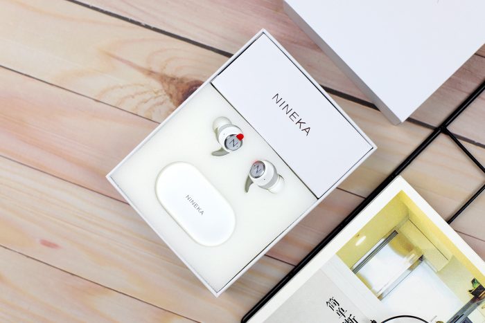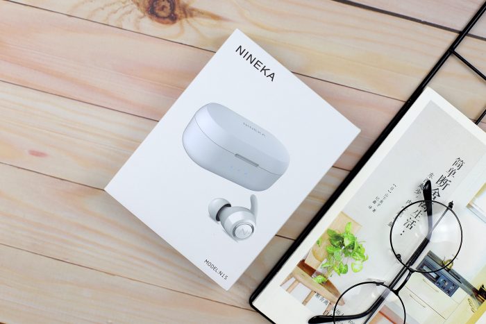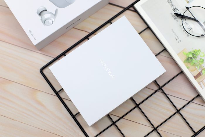 抽屉式的设计的内盒,从外壳抽出就能看到一只纯白色的盒子,正面是暗刻亮面工艺的“NINEKA”字样。盒内是这类蓝牙耳机比较流行的布置,防震措施做的不错。