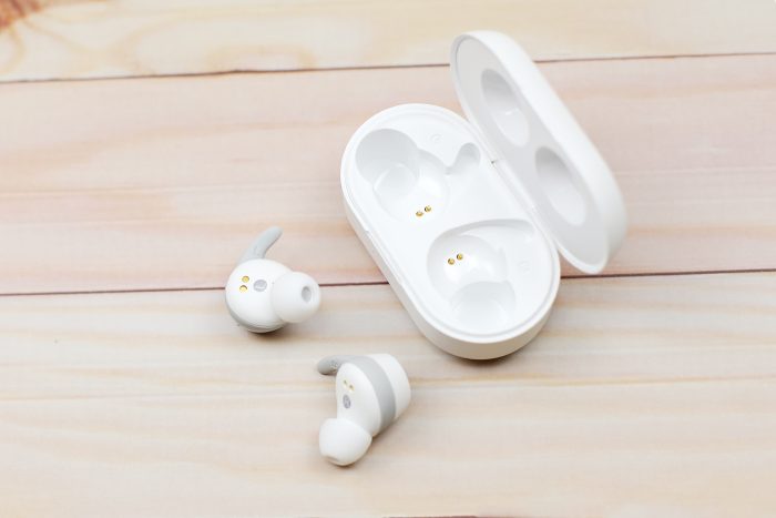 耳机配有白色的耳帽和灰色的耳撑。耳帽为航空及硅胶材质,入耳舒适,随机附带的共有2套大号,1套中号,2套小号,基本可以满足不同用户的使用需求。同时,南卡N1S还贴心的为用户设计了配套的耳挂,搭配人耳角度的锁合技术组成三点人耳支撑,在运动时也能牢固稳定,不易滑落。
