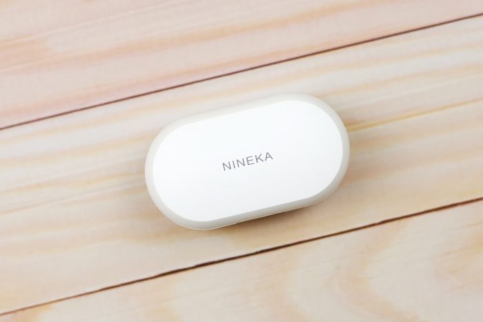 上一代产品南卡 N1的充电盒是比较有特色的圆柱状,而N1S则改成了主流的带弧度的方盒,尺寸约 68*38*32 mm 。白色的盒子表面为类肤手感,略带一点磨砂的质感,上面印着“NINEKA”字样。