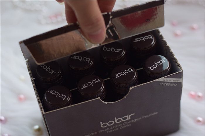 将包装从顶部打开,我们就可以直接看到BOBAR雪莲胶原蛋白肽风味饮的瓶子了,每一盒有8瓶。