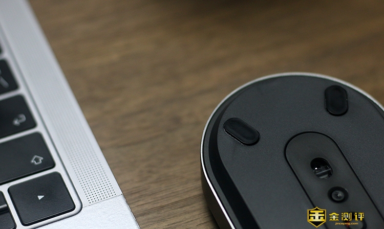 而整个灰色的鼠标主体上平面并非纯平面,而是四周向中央稍稍变薄来,形成了一个“盆地”式的设计。