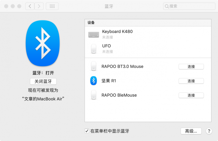 电脑或者手机端便会搜索到蓝牙列表中的“RAPOO BT3.0 Mouse”和“RAPOO BleMouse”,选择一个点击连接: