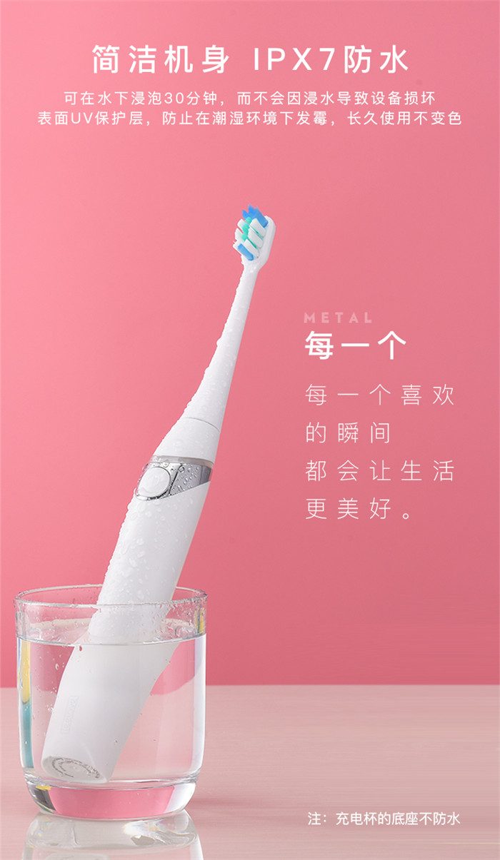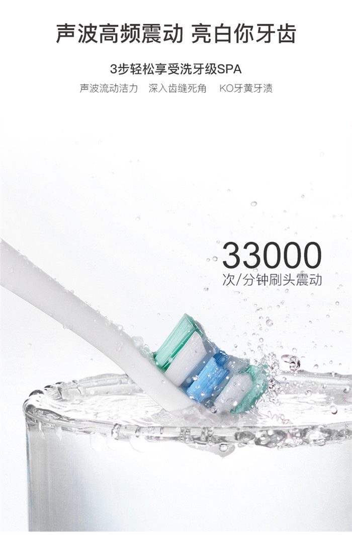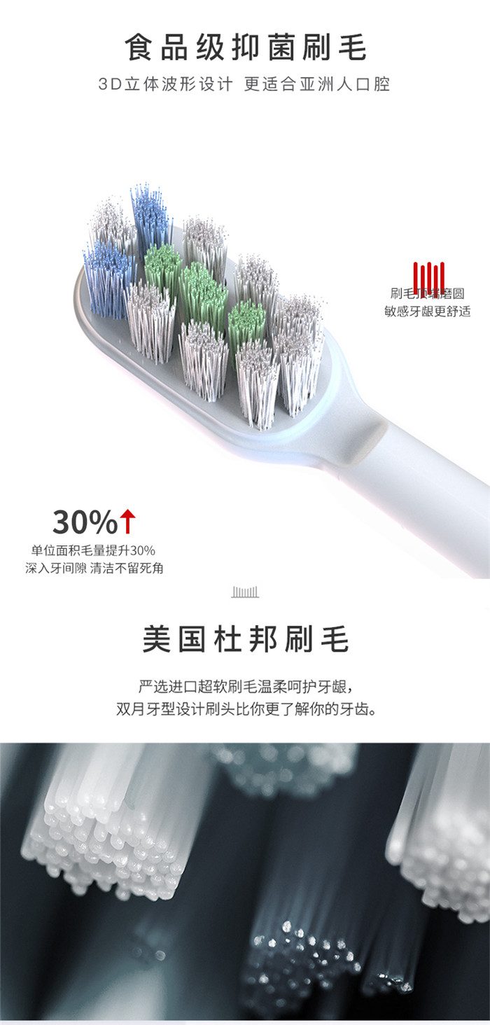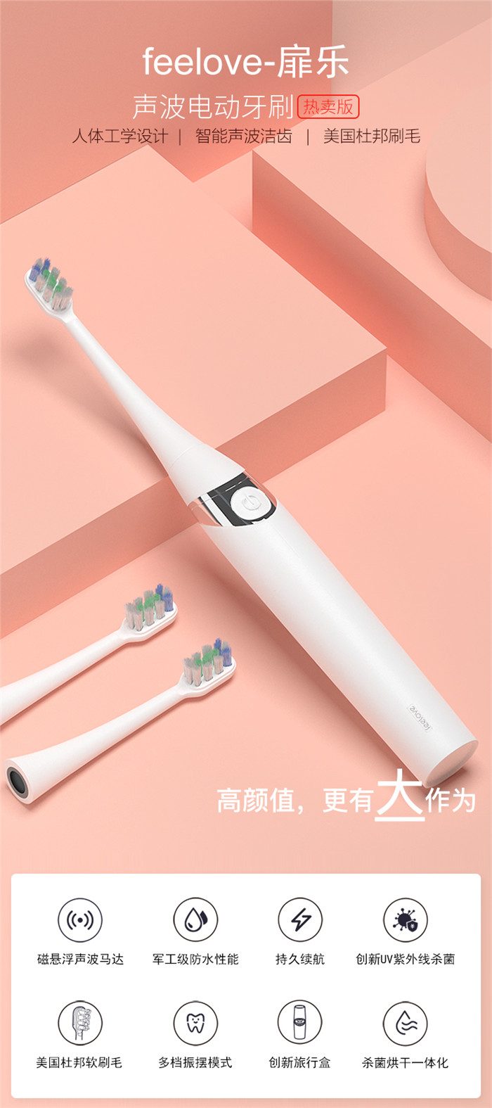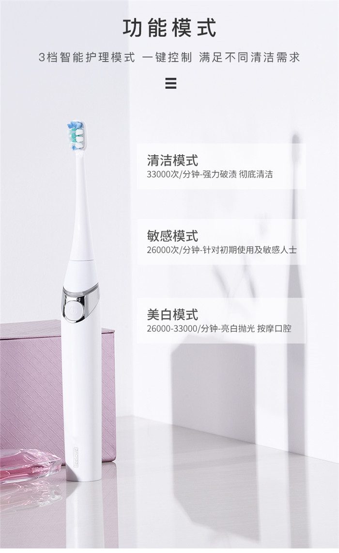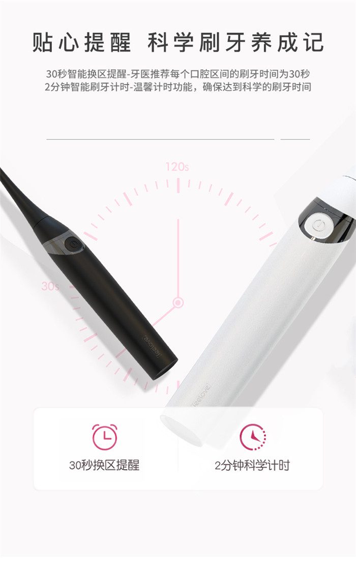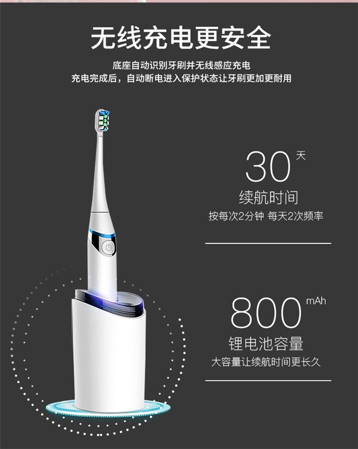 Feelove扉乐电动牙刷,高颜值,独创消毒杀菌功能更有大作为! 1、自动感应杀菌烘干功能,为牙齿健康保驾护航,独创创新UV紫外线杀菌消毒,杀菌率高达99.72% 2、升级高效能磁悬浮马达,33000次/分钟声波震频比起手动刷牙清洁效率提高150倍,清洁美白动力更进一步。 3、食品级美国杜邦进口3D软毛,单位面积毛量提升30%,特制3D波形设计结构布局,更适合亚洲人口腔,既容易贴合牙齿,又不会误伤牙龈,洁齿护龈效果翻倍。 4、清洁、敏感、美白三档智能护理模式,一键控制,满足不同清洁需求 5、无线感应充电更安全,稳定续航超30天 6、智能芯片,自动记住你的使用习惯,再次开机,自动跳转到上一次使用模式 7、贴心提醒,30秒智能换区提醒,2分钟智能刷牙计时 8、智能过压保护,感应检测力度,智能降低振幅,避免损伤口腔 9、静音缓震,手感舒适,防滑亚膜手柄,符合人体工学的刷颈设计 10、高颜值实力派,创新设计旅行盒套装,搭配IPX7级防水