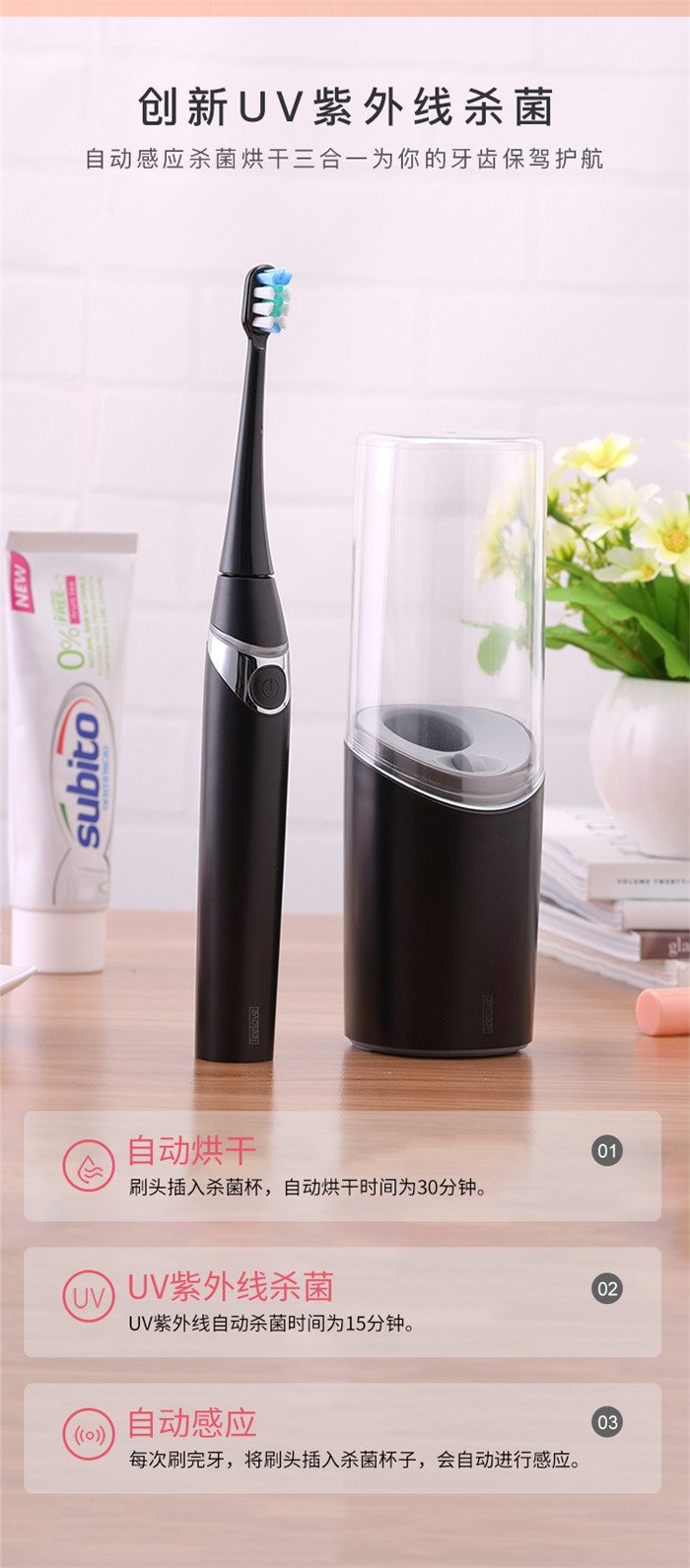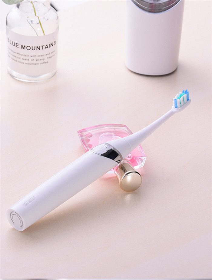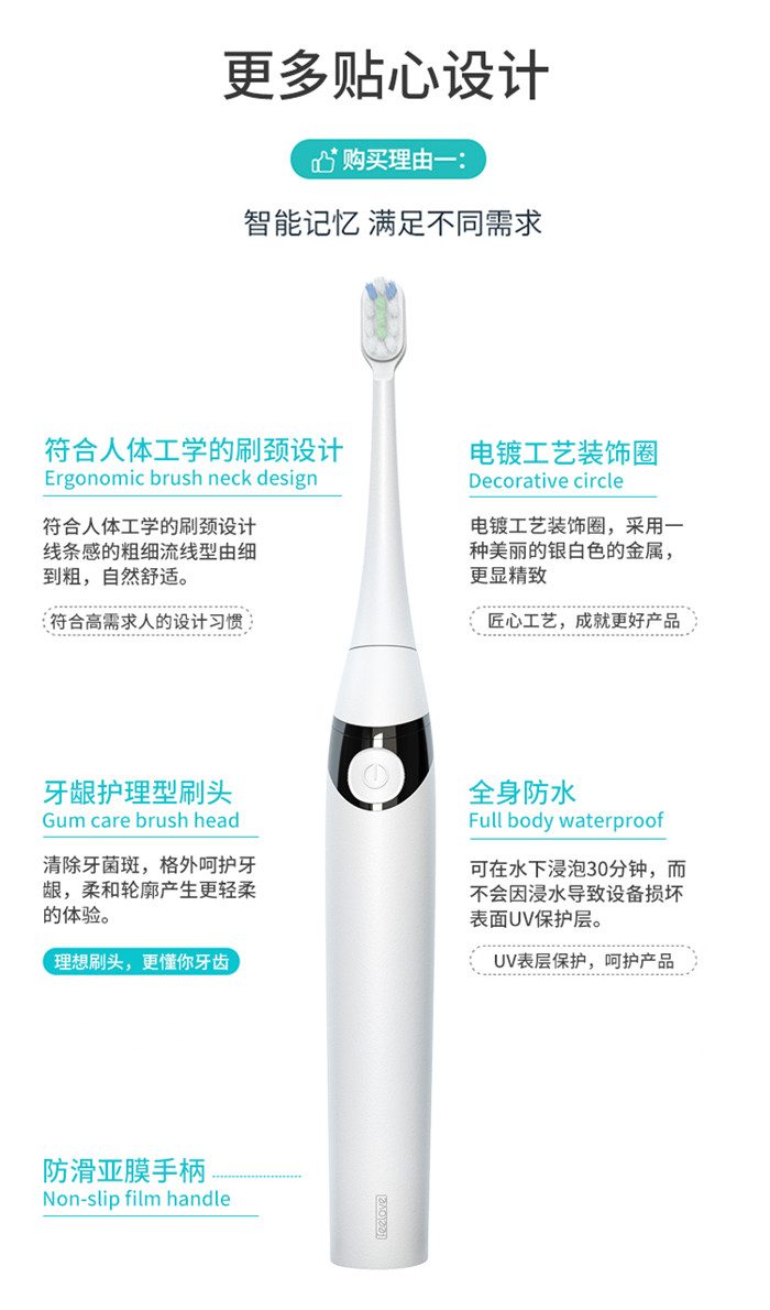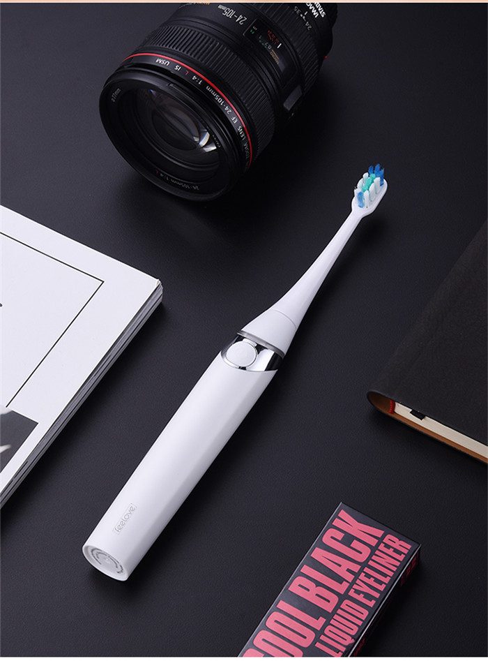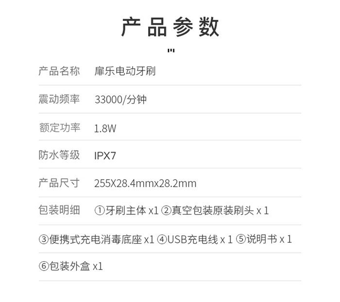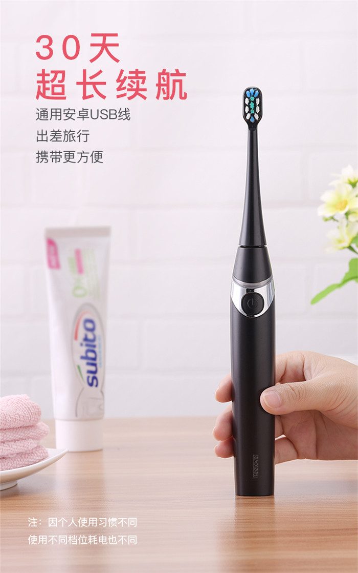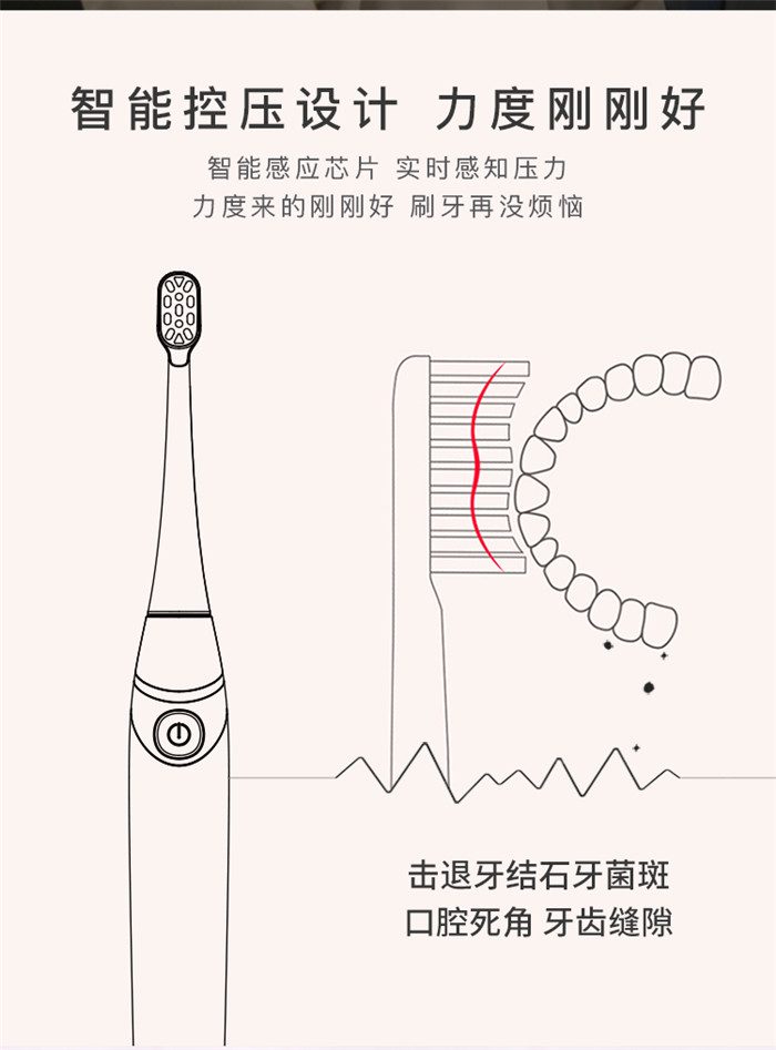Feelove扉乐电动牙刷,高颜值,独创消毒杀菌功能更有大作为! 1、自动感应杀菌烘干功能,为牙齿健康保驾护航,独创创新UV紫外线杀菌消毒,杀菌率高达99.72% 2、升级高效能磁悬浮马达,33000次/分钟声波震频比起手动刷牙清洁效率提高150倍,清洁美白动力更进一步。 3、食品级美国杜邦进口3D软毛,单位面积毛量提升30%,特制3D波形设计结构布局,更适合亚洲人口腔,既容易贴合牙齿,又不会误伤牙龈,洁齿护龈效果翻倍。 4、清洁、敏感、美白三档智能护理模式,一键控制,满足不同清洁需求 5、无线感应充电更安全,稳定续航超30天 6、智能芯片,自动记住你的使用习惯,再次开机,自动跳转到上一次使用模式 7、贴心提醒,30秒智能换区提醒,2分钟智能刷牙计时 8、智能过压保护,感应检测力度,智能降低振幅,避免损伤口腔 9、静音缓震,手感舒适,防滑亚膜手柄,符合人体工学的刷颈设计 10、高颜值实力派,创新设计旅行盒套装,搭配IPX7级防水