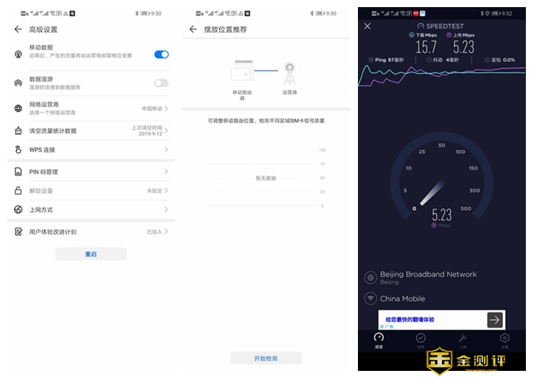 因为靠运营商信号联网,有的房间可能要靠近窗户,才能保证信号强度,在网络不好的时候可以看到测速只有15.7Mbps,还不到最高值的9分之一。