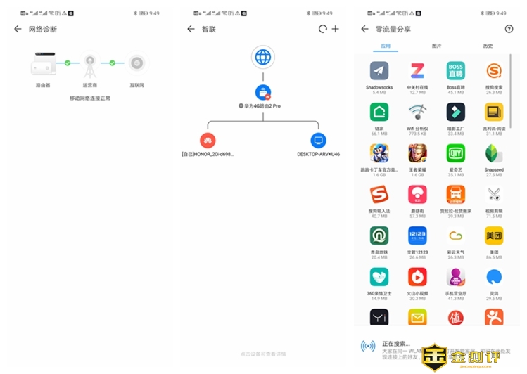 即使网络真出现问题,也可以通过自带的网络诊断功能,了解问题出现在那个部分,内部自己解决,运营商的问题也可以及时报修,智联可以看到各个层级的联网设备,以发现是否有非法接入的网络设备,零流量分享是针对安装了智慧生活APP的用户,在同一WiFi网络中,不耗流量分享已经安装的APP等。
