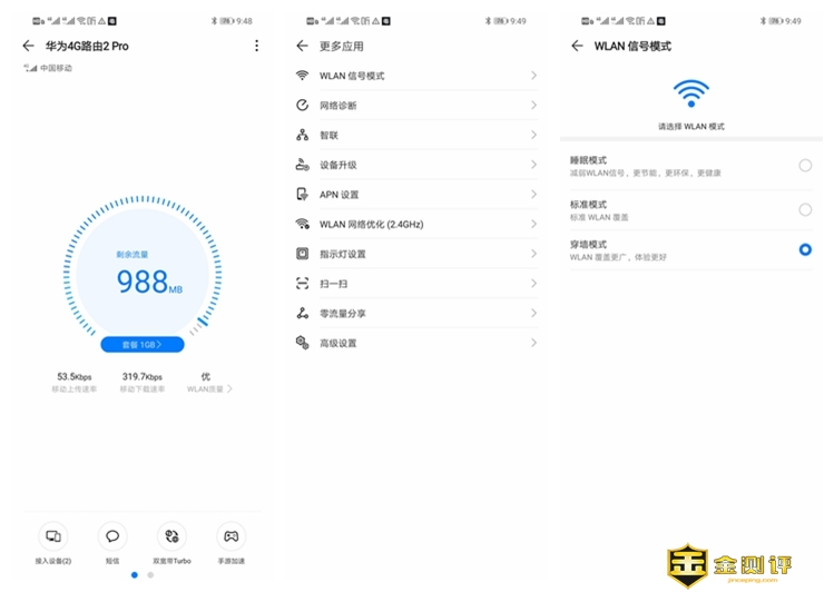 过一段时间查看流量使用,还是比较惊人的,毕竟电脑等设备的数据流量远超手机,还是套餐比较靠谱,WLAN的信号模式可以从三种中选择,如果房子面积比较小,可以用标准模式,而墙比较多面积又大,最好开启穿墙模式,实测我3居室的环境,基本没有死角,都可以连接到网络,只是在最远处速度会比较慢。