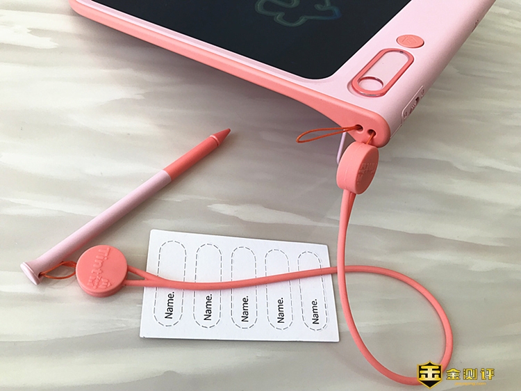 5、挂绳口+双向硅胶挂绳:配套的粉色多功能硅胶挂绳,用料和做工都还是很良心的,用它能把画板主体和彩色渐变画笔轻松关联,可挂可背安全坚韧不易丢失。