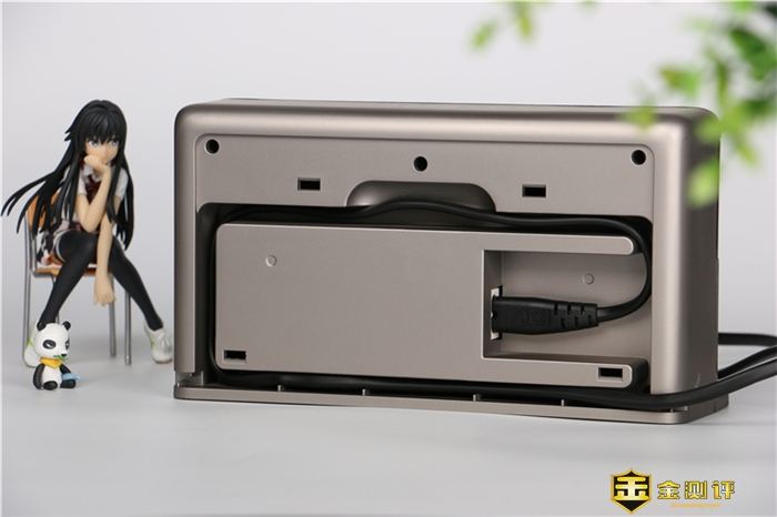 充电座背面设计有收线槽,如果用户插座距离充电底座比较近的话,可以将多余的线收纳进收线槽中,而后盖上背板,就不会显得那么凌乱。同时出厂时候,背板上有相应的提示,告知用户充电槽的摆放要求。