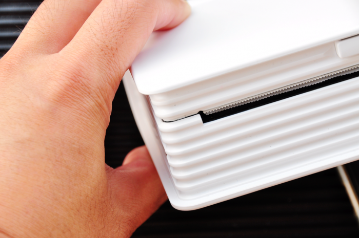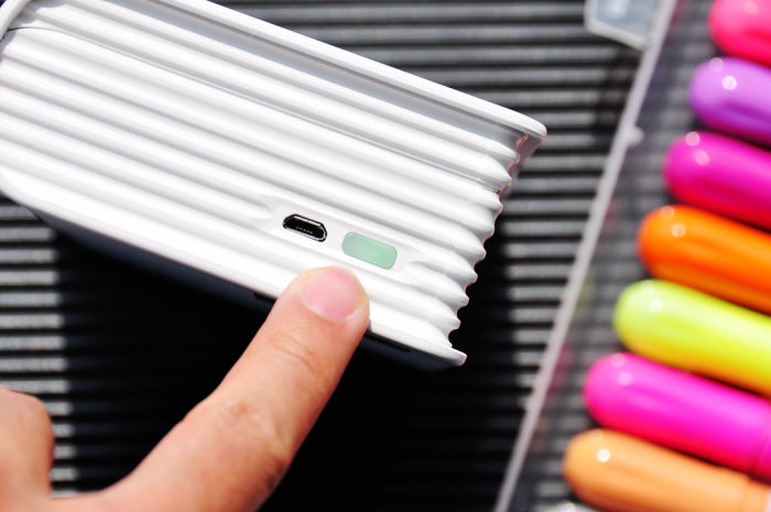 机身底部右下角的位置分别为打印机的Micro-USB接口以及电源键,开机后电源键为常亮的绿色状态。