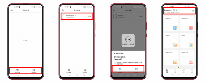 继续点击主页面的右上角添加设备按钮进入添加设备页面,点击查找设备,选择名为“Paperang_C1”的设备并点击连接即可。连接成功后,页面会弹出“连接成功”提示,另外主页面左上角的设备名称后面会出现绿色连接标志。点击设备名称可进入设备管理界面,我们可以对设备进行重命名,设置自动关机时间,查看固件版本号、剩余电量、MAC地址、设备编号等信息。