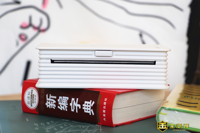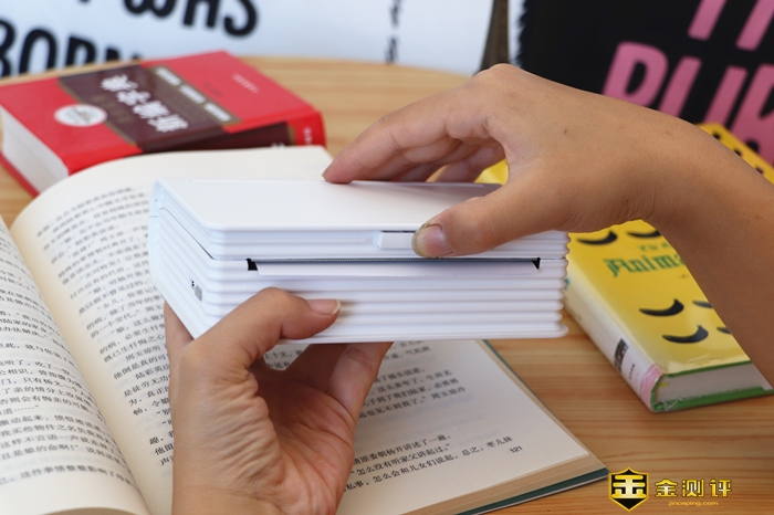 喵喵机MAX的机身形状设计与一本字典很相近,纸张的形状都勾勒出来了,45mm的厚度上要比字典厚些。