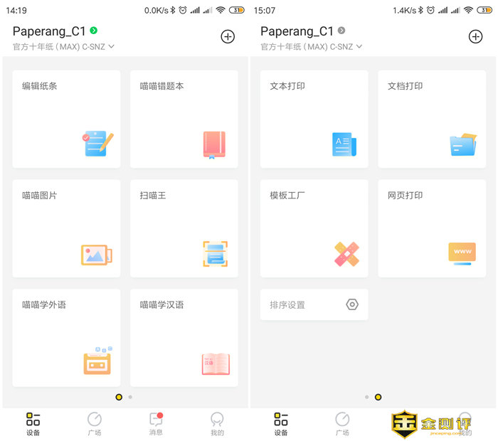 喵喵机MAX配对方法很简单,打开蓝牙和喵喵机即可轻松完成配对,可见喵喵机MAX型号为C1。喵喵机APP 把主要功能整合为10个版块,包括编辑纸条,喵喵错题本,喵喵图片,扫描王,喵喵学外语,喵喵学汉语,文本打印,文档打印,模板工厂和网页打印。