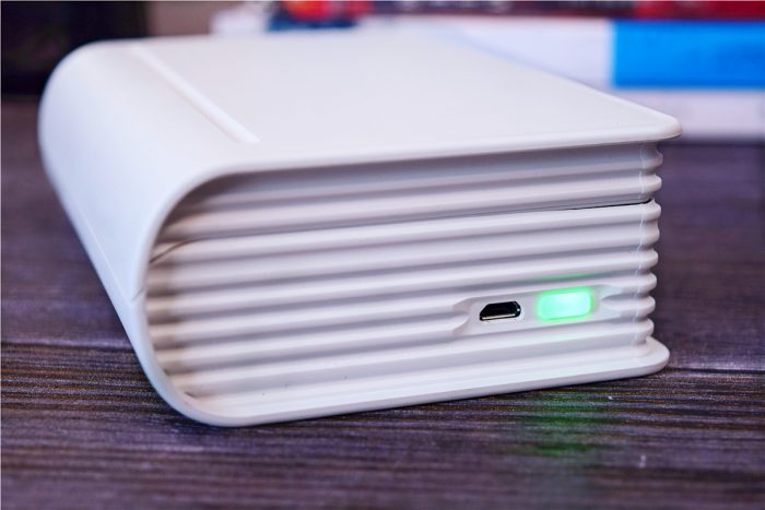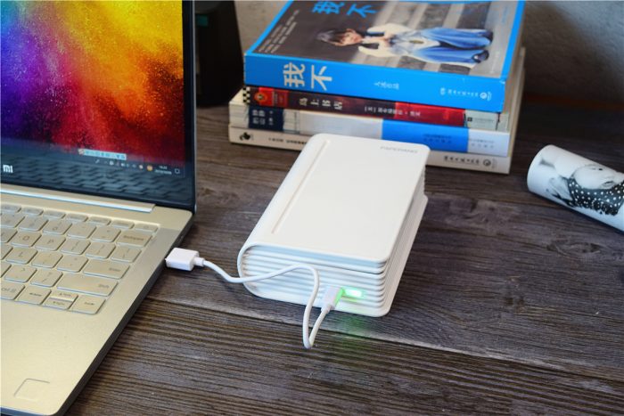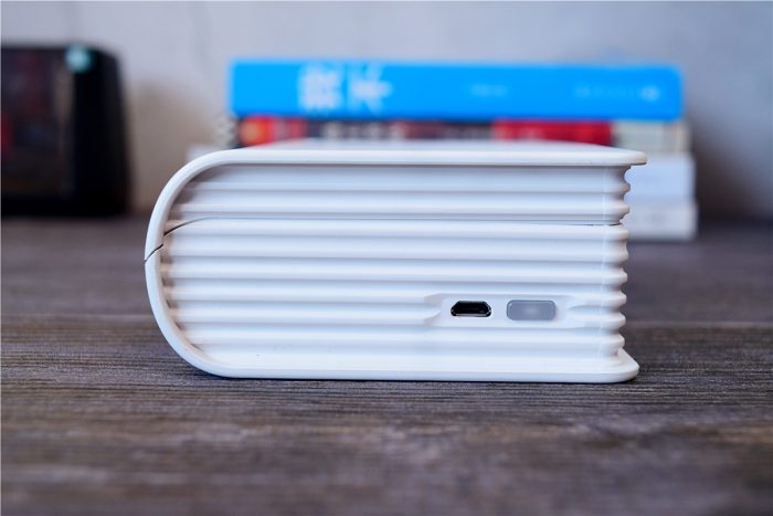 为了不影响整体的书本造型,机身上的接口和按键都被放在了侧面,其中充电口采用了Micro USB接口,除了充电外,还能和电脑连接使用;在充电口右侧是电源键,集成了柔性指示灯,长按3秒为开机/关机,待机状态下指示灯为绿色常亮,电量不足、耗材不足、机盖未关、打印头过热时指示灯为红色慢闪。