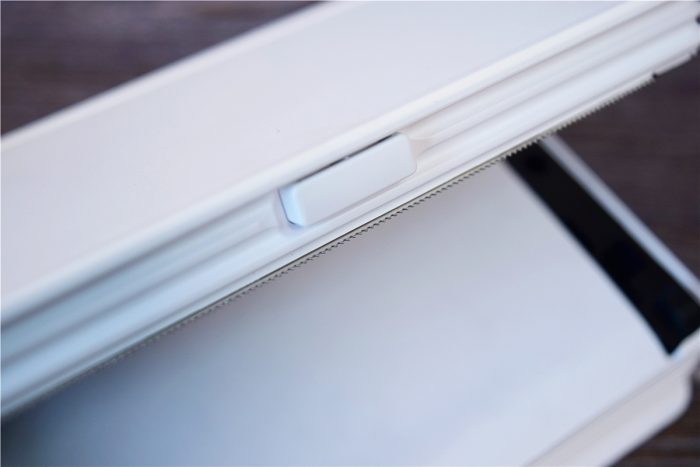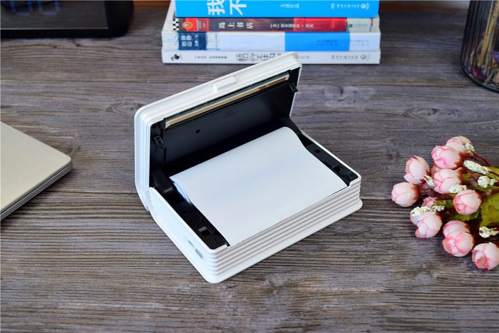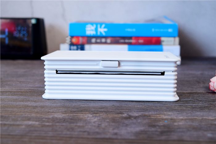 机身前方是打印口,被巧妙的融合在了条纹之中,其中在打印口处还加入了宽幅纸刀,打印完毕后只需轻轻一撕即可将纸切断,靠近上方的中间位置是开盖键,按压即可开启上盖,进行耗材更换等操作。