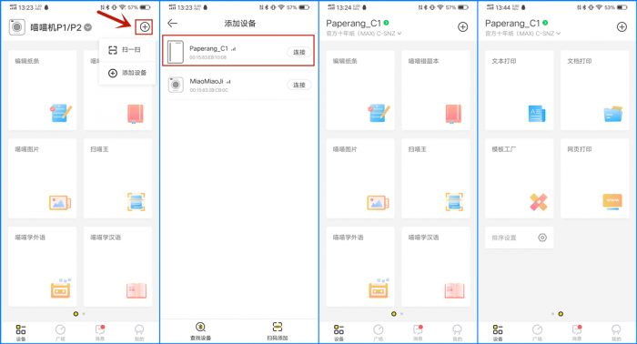喵喵机MAX的添加设备操作也简单,可以根据扫描设备或蓝牙进行连接,成功后会自动进入到“设备”界面,分为编辑纸条、喵喵错题本、喵喵图片、扫喵王、喵喵学外语、喵喵学汉语、文本打印、文档打印、模板工厂和网页打印共10个选项,可以方便用户根据实际需求快速进行选择。