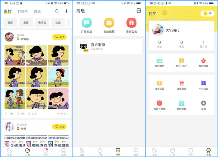 在“喵喵机”APP界面下方除了“设备”选项外,还有广场、消息和我的共3个选项,通过“广场”界面还分为素材、订阅号和精选共3个选项,其中都是些用户提供的打印素材,大家可以自由选择打印;通过“消息”选项,可以查看广场动态和活动公告。