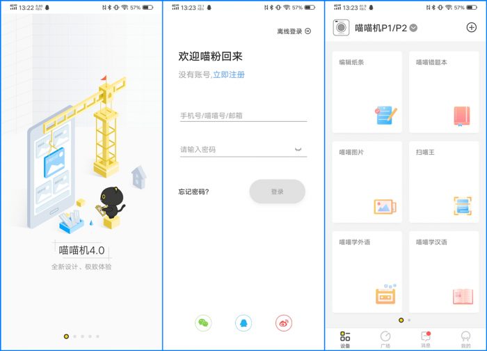 喵喵机MAX需要配合手机APP才能正常使用,首次使用需要先进行设备添加,长按电源键3秒开机,在手机端安装“喵喵机”APP并开启,然后还需要进行账号登录,支持微信、QQ和微博第三方账号直接登录,这个还是很方便的。