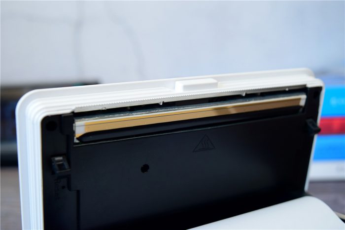开启上盖后,在内侧靠近上方的位置是热敏打印头,采用了日本专业打印头,能够带来300dpi视网膜级别的打印分辨率,让打印画面更加清晰细腻,注意机器工作时不要去触碰打印头,以免烫伤。