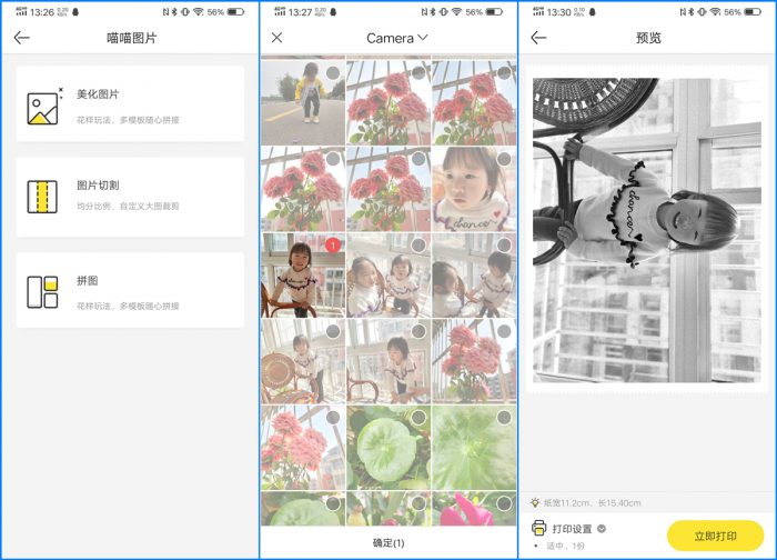 喵喵机MAX除了能打印文字外,还可以进行图片或照片打印,而且还支持美化图片、图片切割和拼图操作,功能还是比较丰富的。通过直接对手机中照片的打印测试,整体效果还不错,不过靠近还是能够看到颗粒感的。