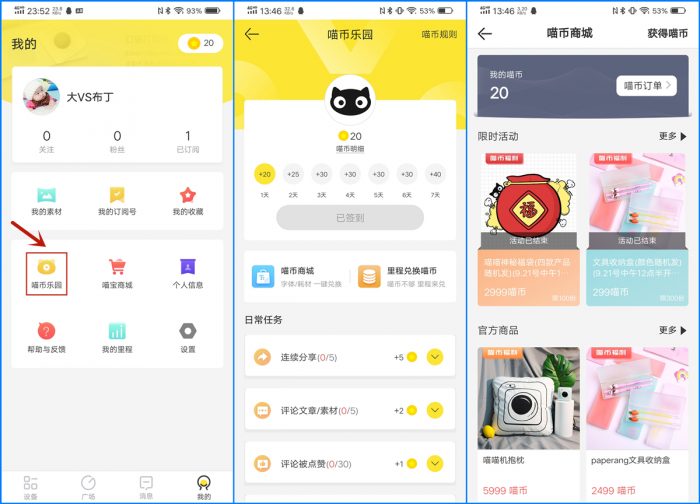 在“我的”界面还有个“喵币乐园”选项,进入后我们可以通过签、日常任务获得喵币,还能通过里程兑换喵币,其中喵币可以通过喵币商城进行奖品兑换,这个还是很不错的。