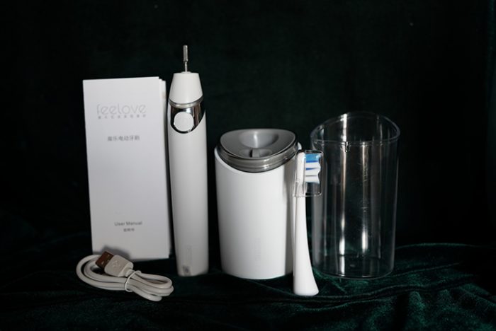 时尚简的包装,承载了这款电动牙刷,包括了无线充电底座、充电线、电动牙刷机身、刷头、漱口杯及说明书。