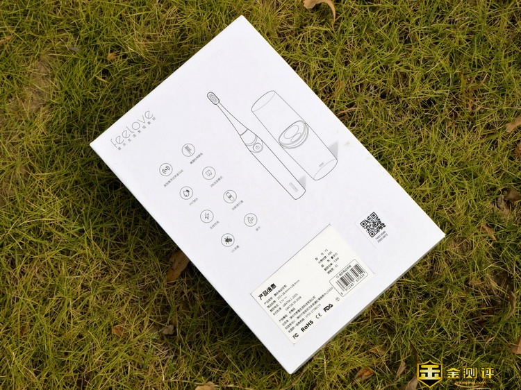 feelove扉乐电动牙刷的包装盒还挺大,也相当厚实,包装盒左上角是扉乐的品牌Logo,中间是产品的外形素描图,下方则是系列和型号包装盒背面介绍了产品的规格参数以及功能特点。