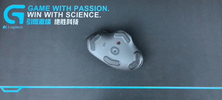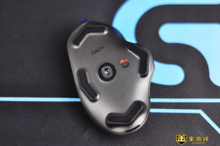 G604底部中间是HERO 16K传感器,旁边是电源开关。底部四周使用了条形脚贴,类似由传感器向四个方向发散的箭头;脚贴外做了内收处理,非常顺滑,大幅减少了鼠标和鼠标垫之间的摩擦。