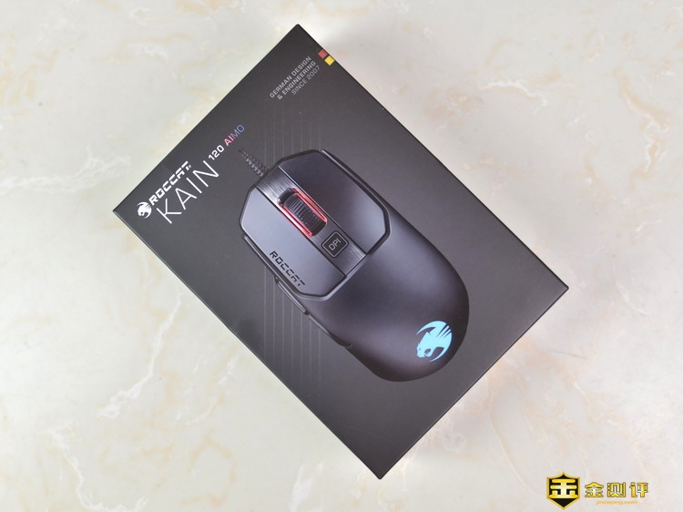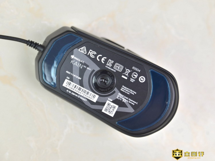 冰豹卡宴120的底部贴有一张大标签,上面有冰豹卡宴120相关的规格参数。在背面正中间,就是冰豹卡宴120强大性能的核心,ROCCAT OWL-EYE传感器,这个传感器具有最大16000DPI。鼠标的前后两端都设计有脚贴,脚贴上还有一层保护膜,使用前需要先揭下来。