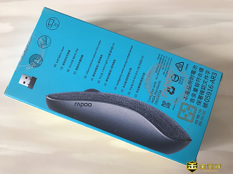 包装的正面中间是醒目的鼠标缩略图,产品本身完完全全的呈现在用户眼前,左上角是鼠标的品牌LOGO,然后自上而下分别是产品的布艺面料、静音微动、蓝牙设备切换的卖点介绍。