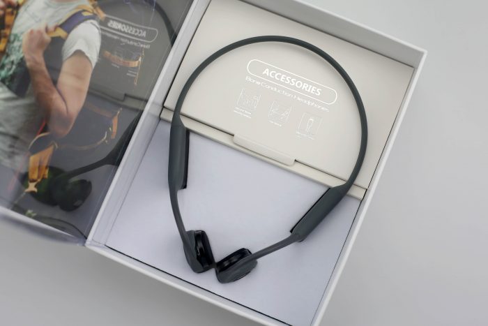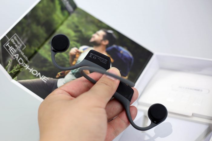 打开包装,左边是一个登山客。右边就是这款耳机的全貌了!如果没接触过骨传导类产品的小伙伴,第一眼看上去可能有点蒙,这东西能塞进耳朵嘛?